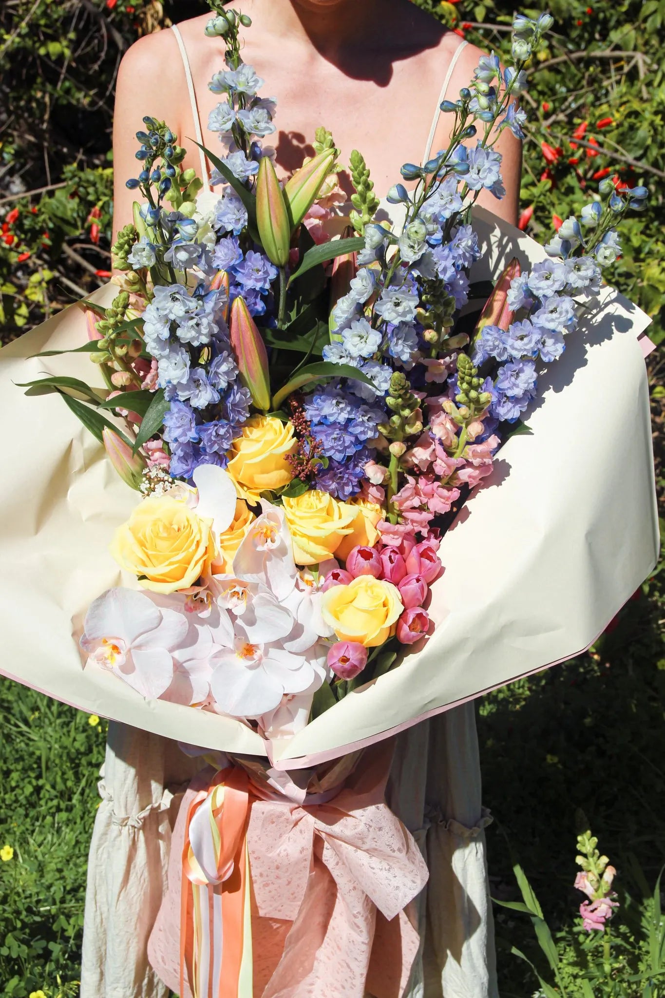 Elegant and tall, the cheer and charm of a storybook cottage garden. Delphinium is a symbol of positivity and openness to new experiences. In addition, they show cheerfulness and goodwill. They’re a great flower to send as a form of encouragement to someone who is down on their luck. If you know someone who needs a little cheering up, send them flowers and make sure to include delphinium! Interesting fact colours of Delphiniums are also used as a dye to colour clothes and other items. Vase life is typically 5-7 days; change water daily and keep out of direct sun.